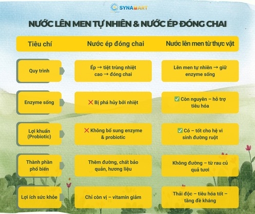 Không giống như nước ép đóng chai thường bị xử lý nhiệt, thêm chất bảo quản và hương liệu nhân tạo, nước lên men tự nhiên được lên men từ trái cây tươi – giữ lại enzyme sống, lợi khuẩn (Probiotic), và các dưỡng chất tự nhiên.